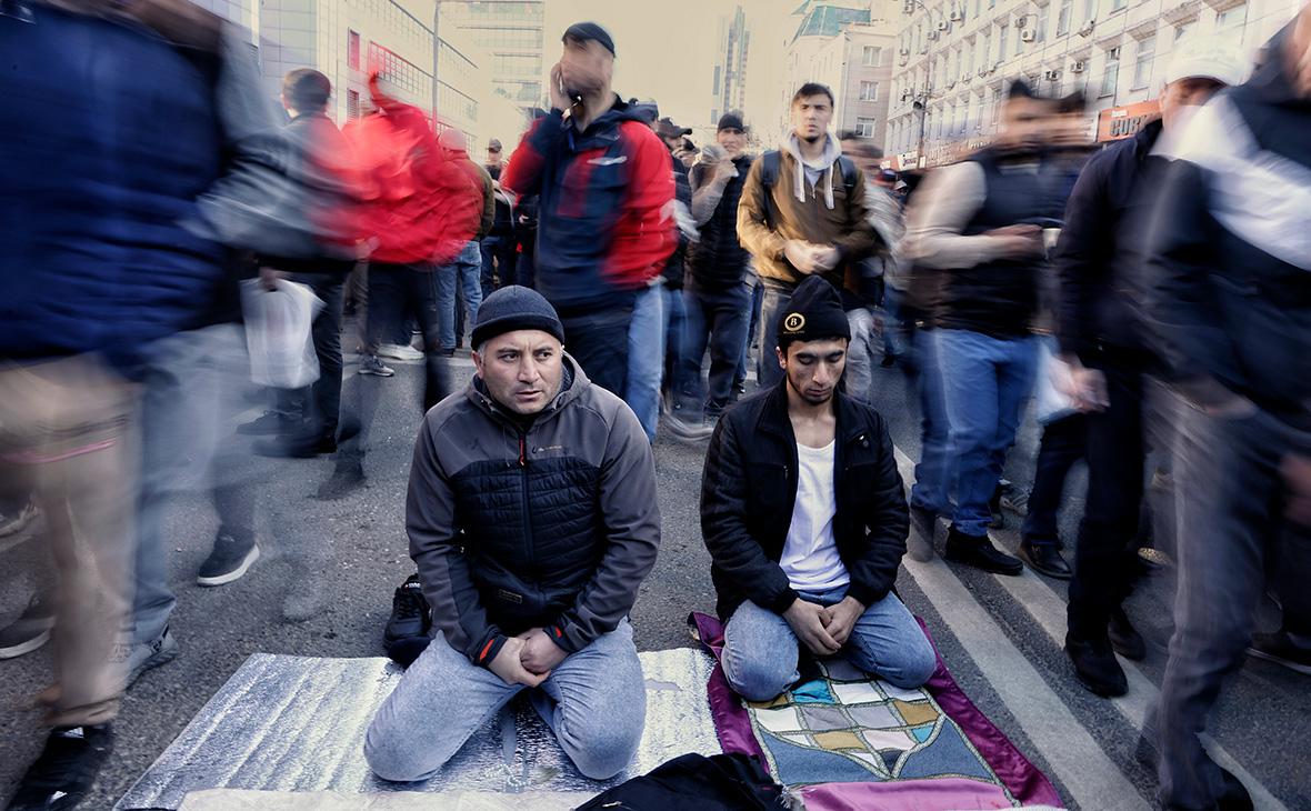 Мусульмане во время торжественного намаза по случаю праздника Ураза-байрам у Соборной мечети, Москва Фото: Андрей Любимов / РБК