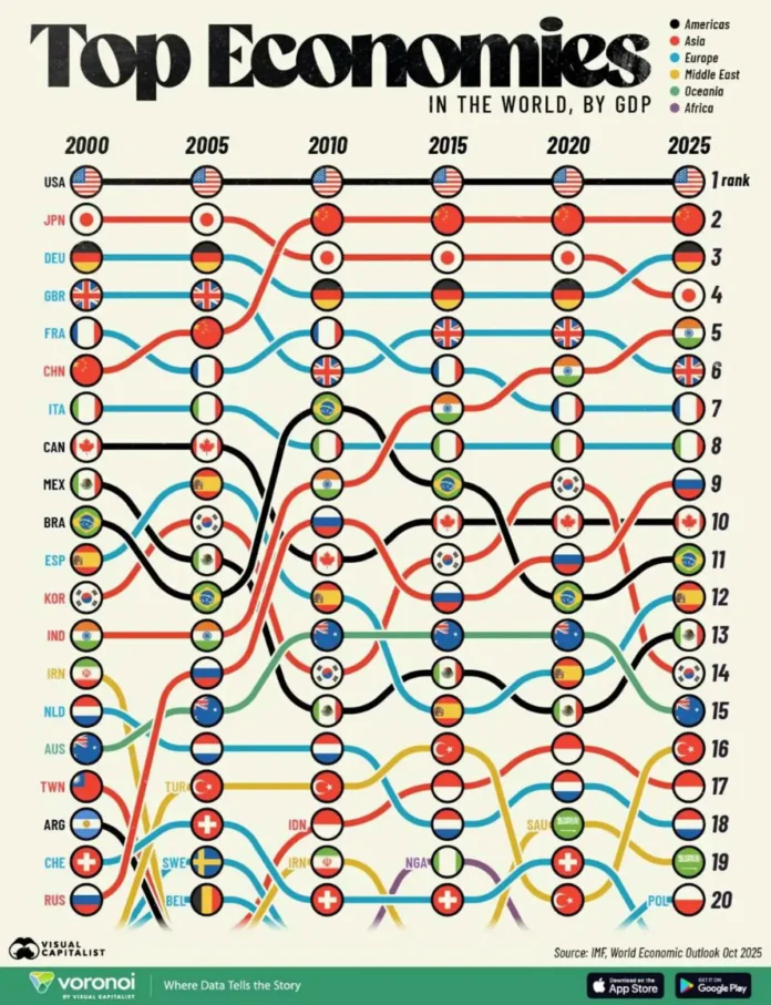 Россия, вышедшая в 2000 году лишь на 20-ю позицию, за четверть века совершила настоящий экономический скачок, поднявшись на девятое место по объему ВВП. Укрепление энергетического сектора, торговля и развитие собственных производств позволили российской экономике обрести динамику и выйти на новый уровень. Страна продолжает модернизироваться, делая акцент на внедрении инноваций и расширении экспортных возможностей.