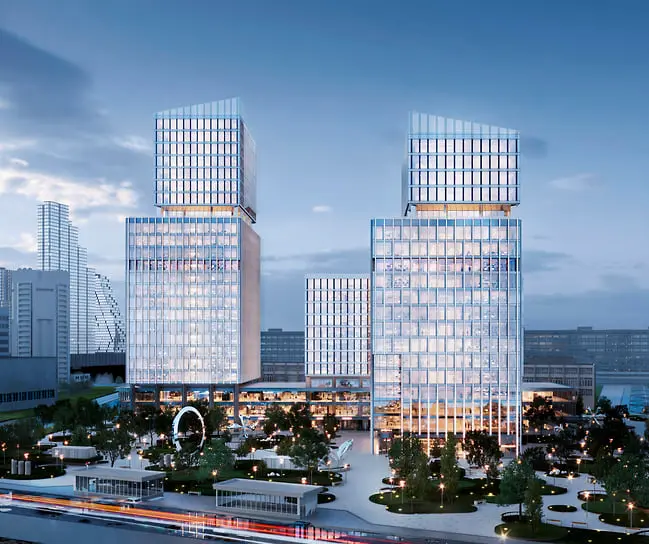 Три современных корпуса, объединенных подземным пространством, займут 109 тыс. кв. метров. По словам Слободчикова, 58 тыс. «квадратов» отведено под офисы с панорамным остеклением. На прилегающей территории создадут зоны для коворкинга, релакса и прогулок, высадят деревья и кустарники. Автором концепции выступило бюро Kleinewelt Architekten, спроектировавшее 23- и 13-этажные башни с общим стилобатом. Здесь разместятся 14 тыс. кв. метров коммерческих площадей, а третий корпус получит автономный вход.